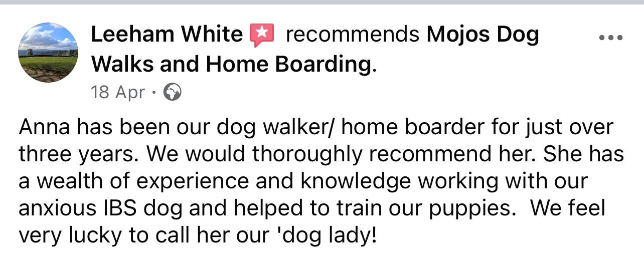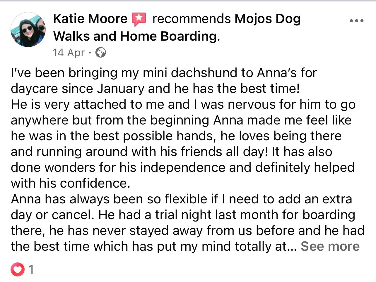 Welcome to The Mojo Dog Walks and Home Boarding , your dog's home away from home dog boarding house. Where we go the extra mile to provide a loving and comfortable environment.